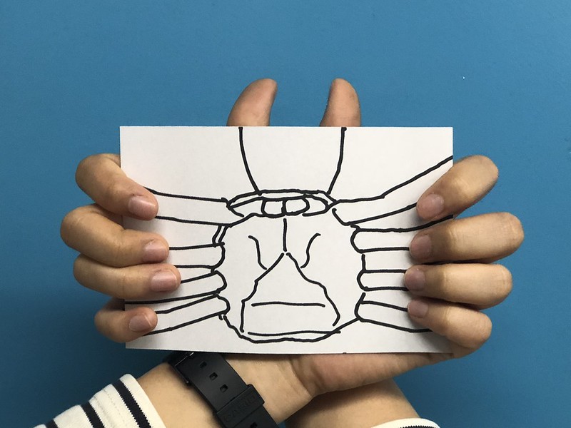 先日お邪魔した岐阜県の情報科学芸術大学院大学の院生の佐藤優太郎さんが作った「蟹の錯覚」。二人で手を前後に交差させて、わしゃわしゃ指を動かすと、自己身体が他者化してとても気待ちが悪い。キモいキモいとあまりに面白いので佐藤さんからいただいた。 pic.twitter.com/dtZGqLXBxi