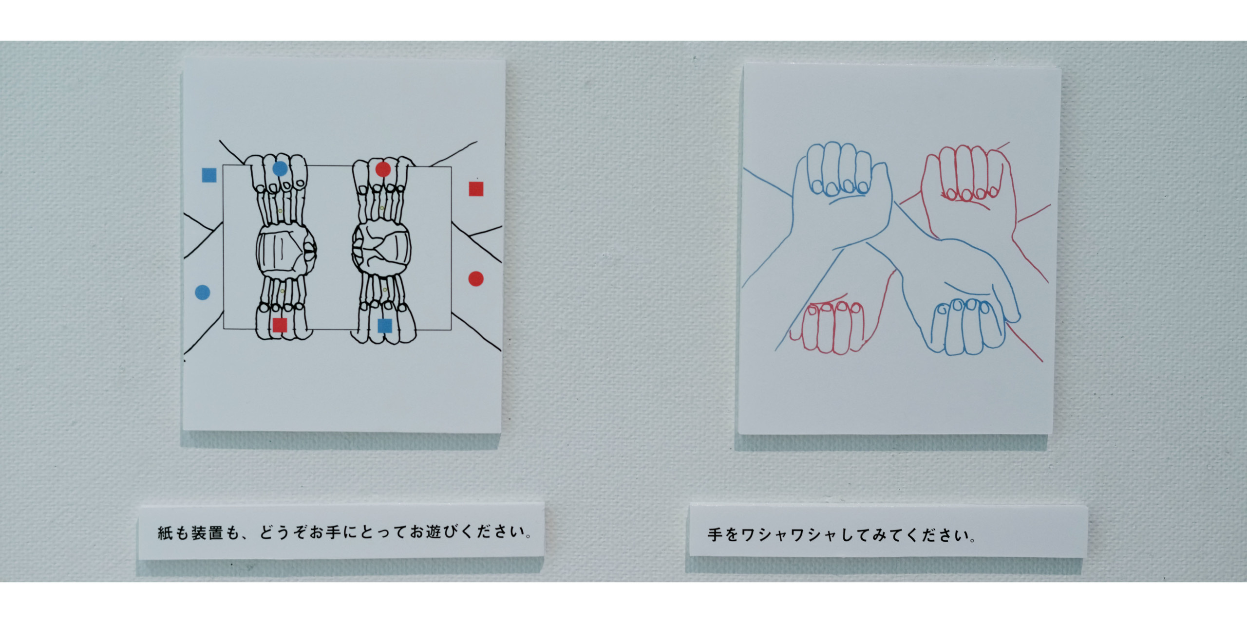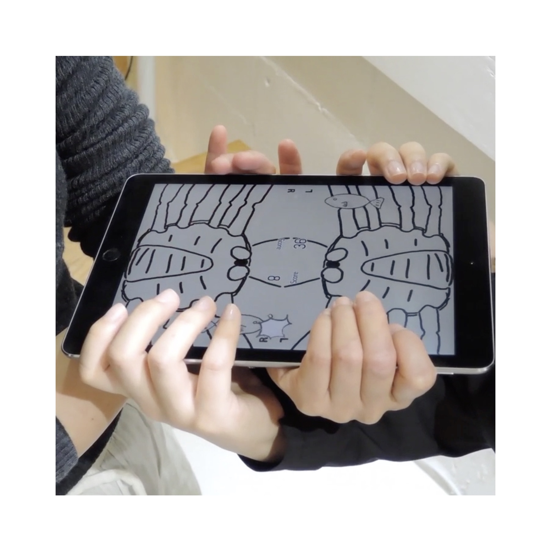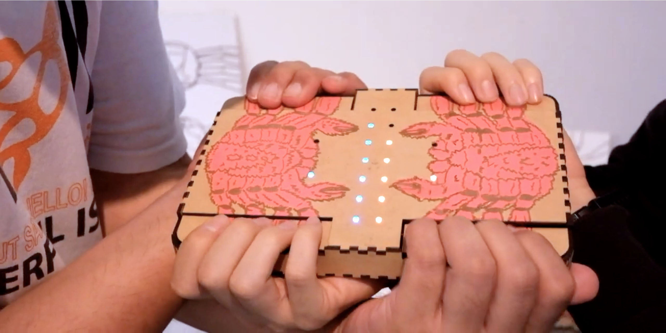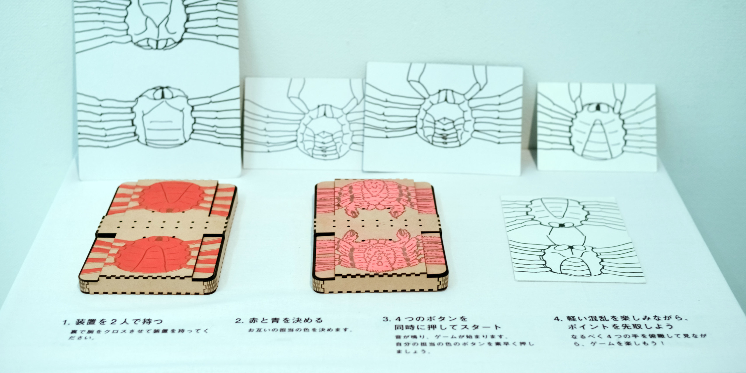 本研究室において考案された「蟹の錯覚」は、左右に交差された手の動きが自分のものでないように感じられる、手に対しての自己主体感が失われる身体の錯覚である。本作では、これを応用し、二人で行う対戦型のゲームへと展開した。 向かい合う二人のプレーヤーはゲーム体験時、お互いの手と左右の手を交差させ、蟹のドローイングの描かれた装置を保持し、装置によってそれぞれの手の帰属が視覚的に遮られた状態となる。こうして自他の手の認識が混同した状態で、点滅するランプに正確に反応する、得点先取型のゲームをプレーする。 体験者のリアクションには、「どれが自分の手かわからなくなる」「気持ち悪い」といったものがある。これらの反応は、錯覚がプレーヤー自身の手の自己感に影響及ぼすことを示唆しており、学術的なフェーズにおいて実験を計画する際の重要な材料となる。本作は、このような認知科学の分野における身体の錯覚の議論を、簡単かつ直接的な形で体感できる装置である。