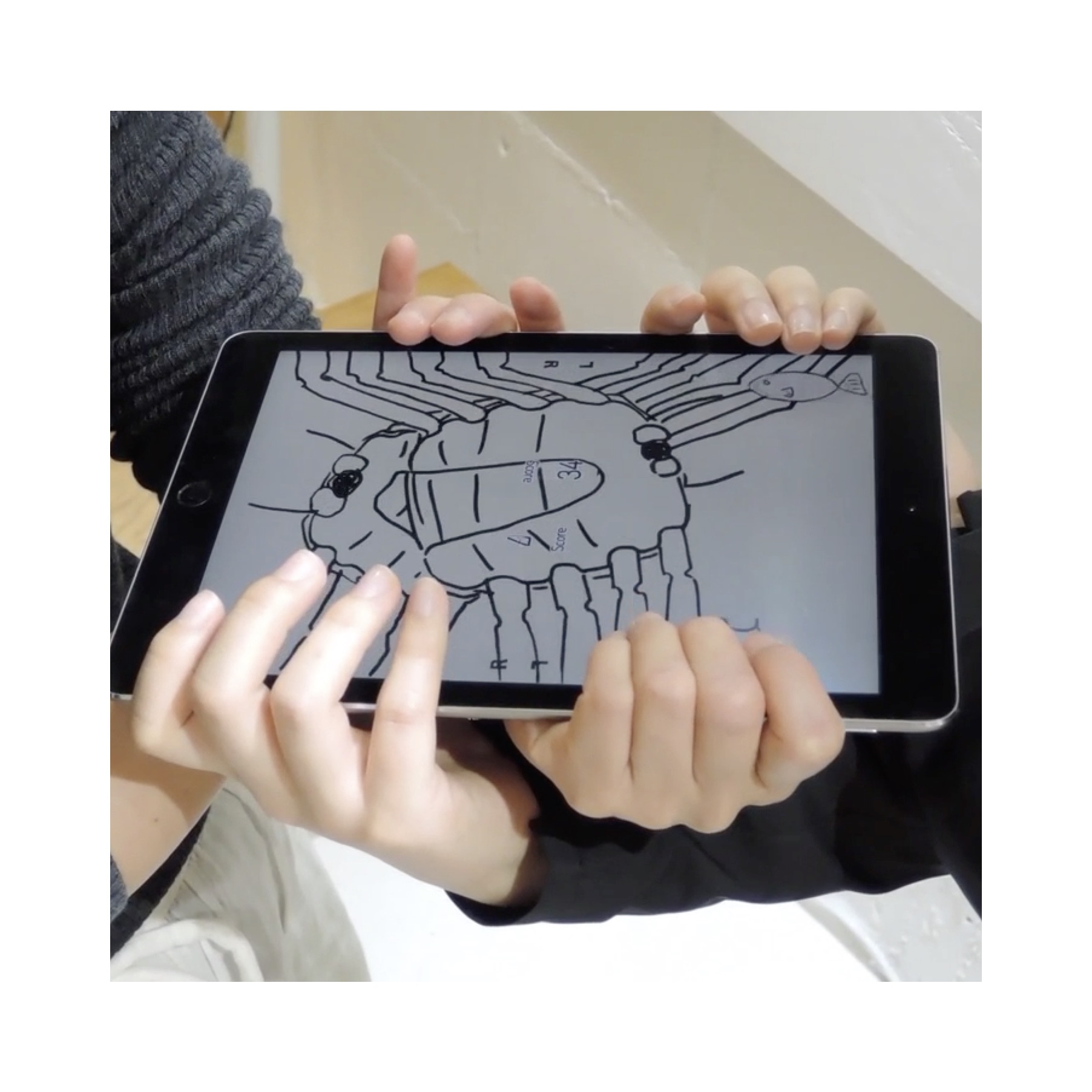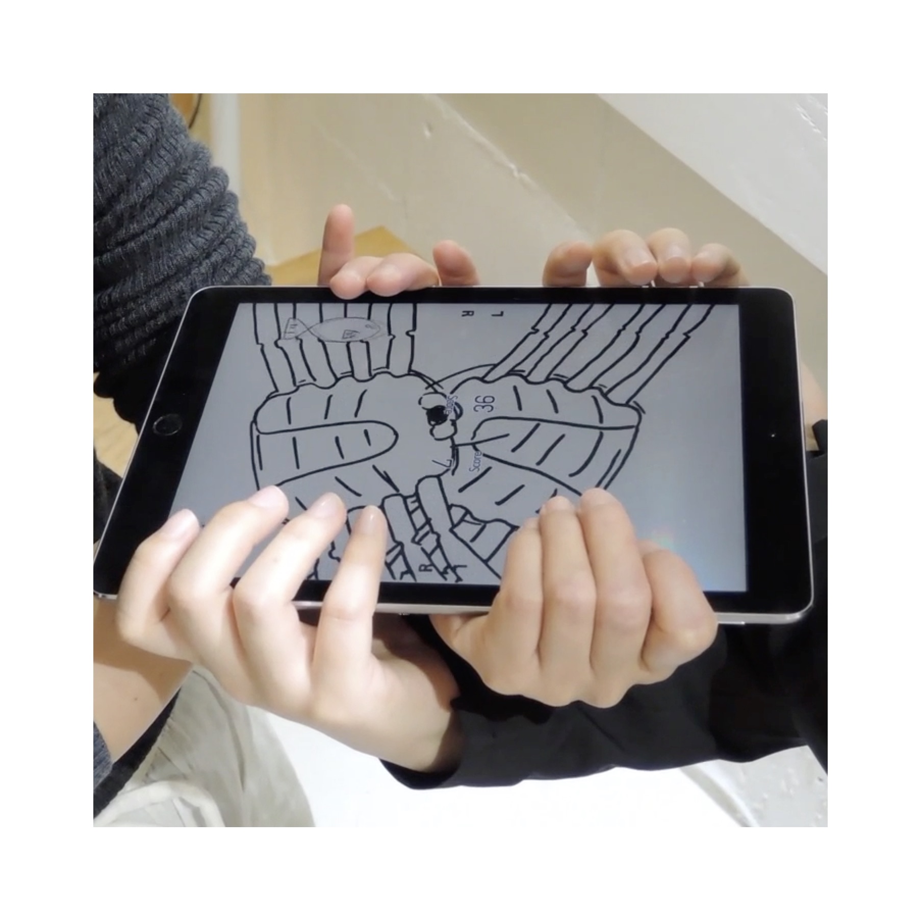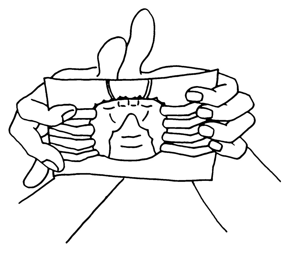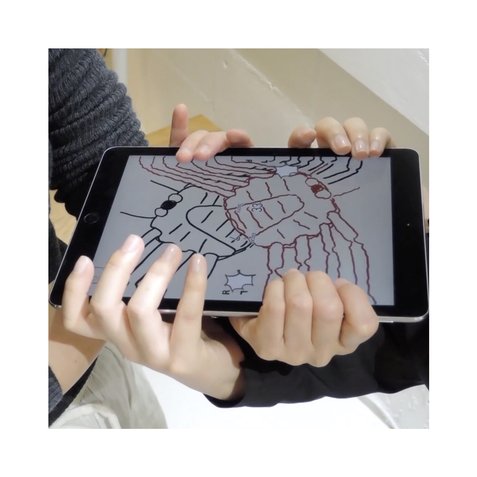 本研究室において考案された「蟹の錯覚」は、左右に交差された手の動きが自分のものでないように感じられる、手に対しての自己主体感が失われる身体の錯覚である。本作では、これを応用し、二人で行う対戦型のゲームへと展開した。 向かい合う二人のプレーヤーはゲーム体験時、お互いの手と左右の手を交差させ、蟹のドローイングの描かれた装置を保持し、装置によってそれぞれの手の帰属が視覚的に遮られた状態となる。こうして自他の手の認識が混同した状態で、点滅するランプに正確に反応する、得点先取型のゲームをプレーする。 体験者のリアクションには、「どれが自分の手かわからなくなる」「気持ち悪い」といったものがある。これらの反応は、錯覚がプレーヤー自身の手の自己感に影響及ぼすことを示唆しており、学術的なフェーズにおいて実験を計画する際の重要な材料となる。本作は、このような認知科学の分野における身体の錯覚の議論を、簡単かつ直接的な形で体感できる装置である。