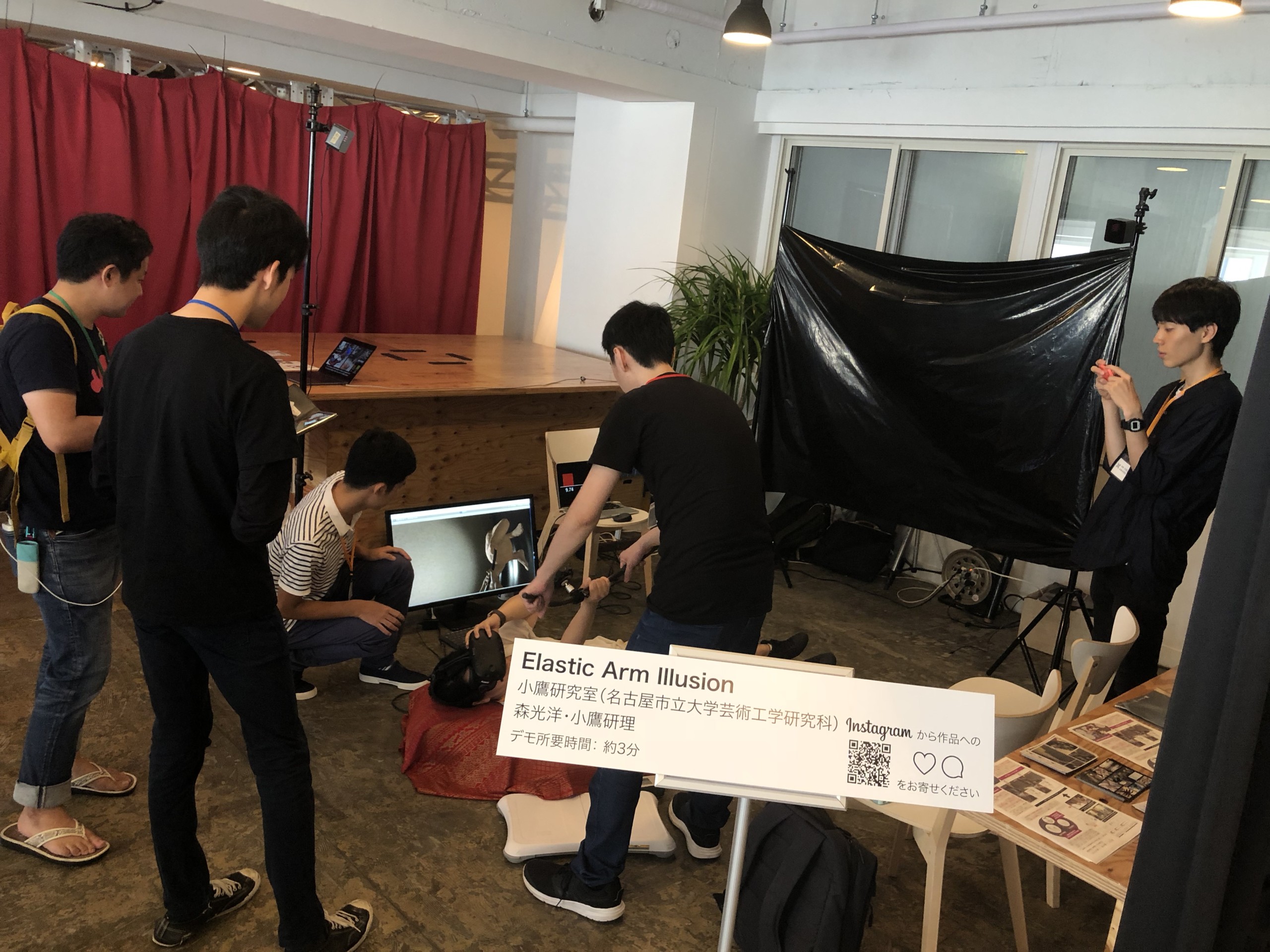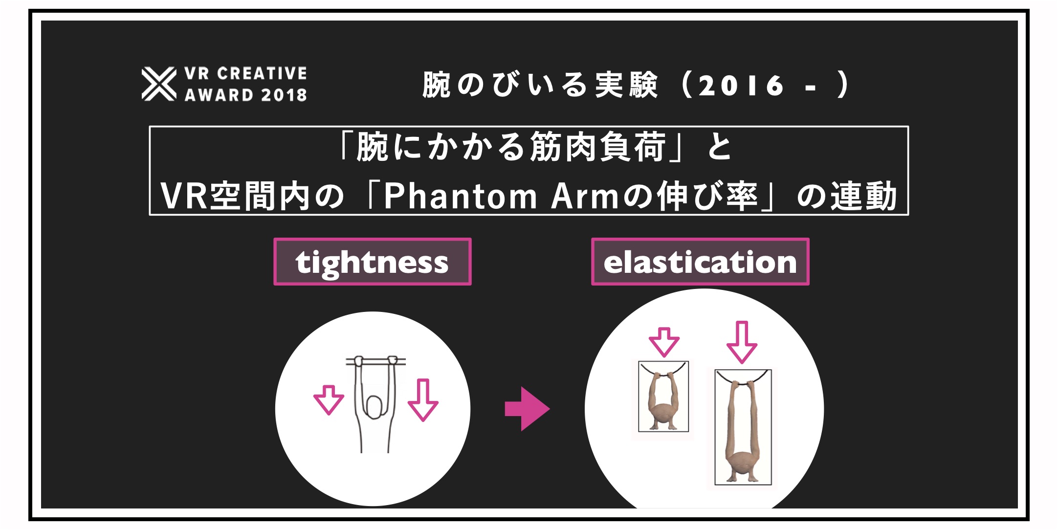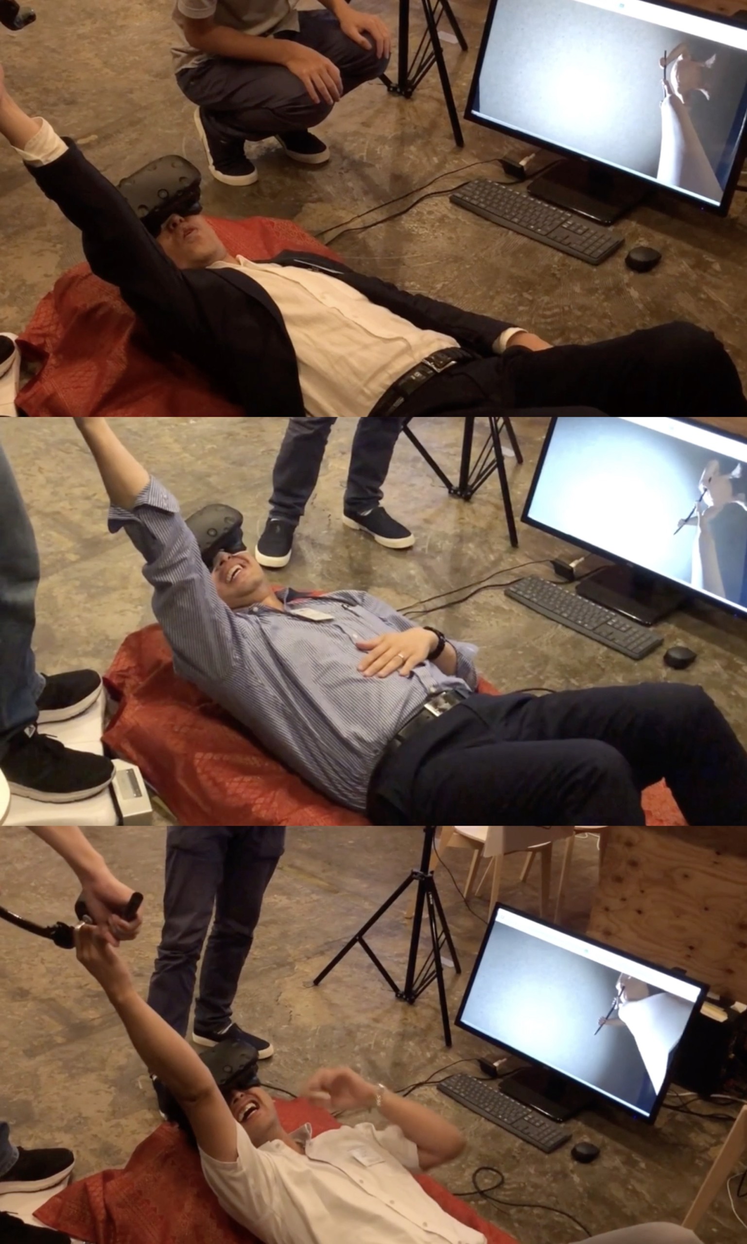 「からだは戦場だよ2018」の予告第三弾は『elastic arm illusion』です。小鷹研の連作「腕が伸びる」シリーズの新作です。仰向けでいる人の腕を、ポールを介して引っ張り上げます。この<引っ張られた度合い>に応じて、HMD上に一人称視点で表示される腕の長さが伸び縮みする、というものです。 pic.twitter.com/5KrwYgGI6e