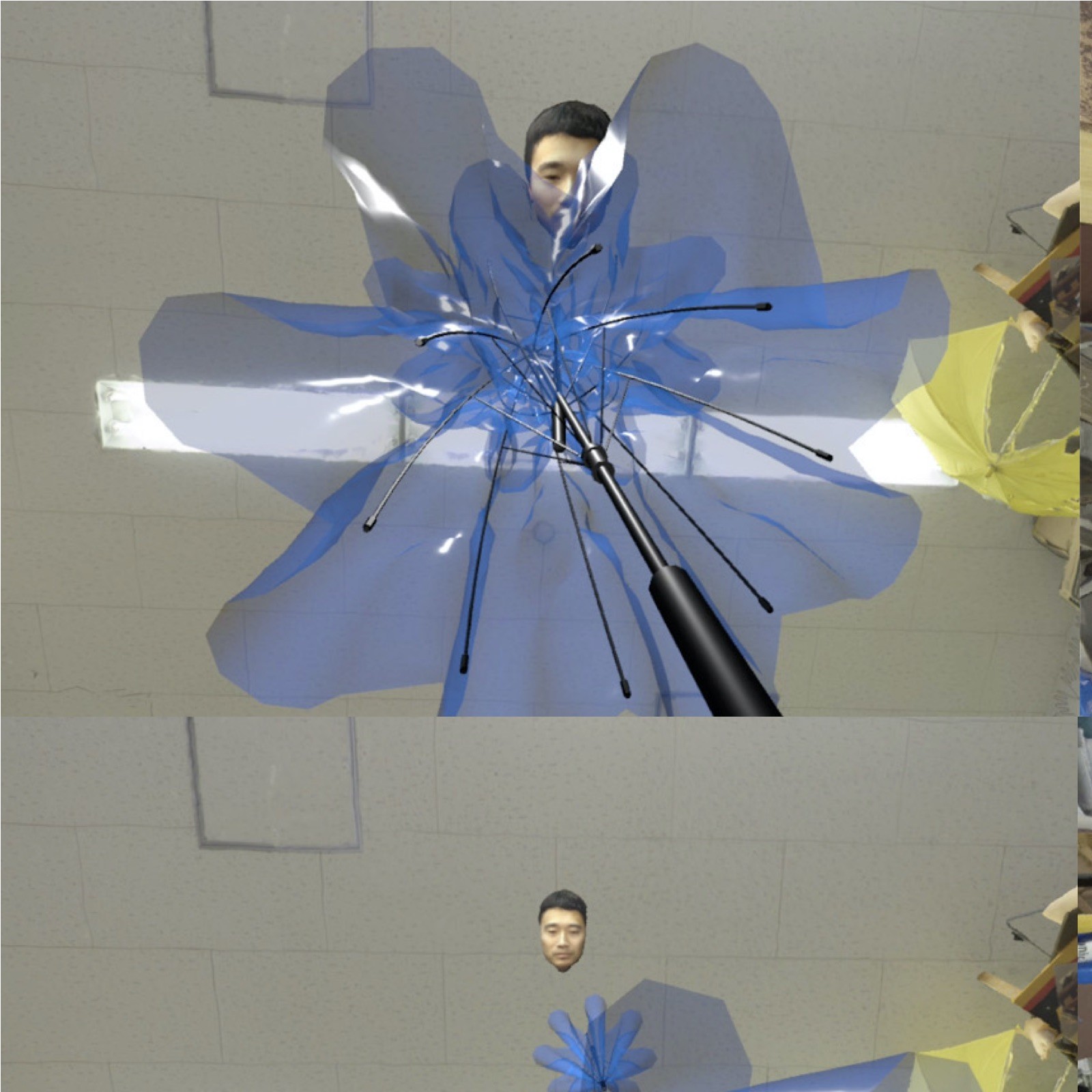 Self-umbrelling is a head-mounted display (HMD) interaction system that provides an experience approximating an out-of-body experience (OBE) involving the reversal of the subjective perception of the direction of gravity. Specifically, opening an umbrella while lying on one’s back switches one’s view from the first-person perspective (1PP) to a third-person perspective (3PP) originating from a position just above the supine body. In addition, the base of the 3PP moves upward every time the umbrella is opened. Thus, through the periodic action of opening the umbrella, the 1PP offers the experience of blowing something away, while the 3PP offers that of being blown away. This interaction is expected to activate a potentially hidden cognitive function related to OBEs, bringing up an important subject for designing HMD interaction between a player and an avatar.