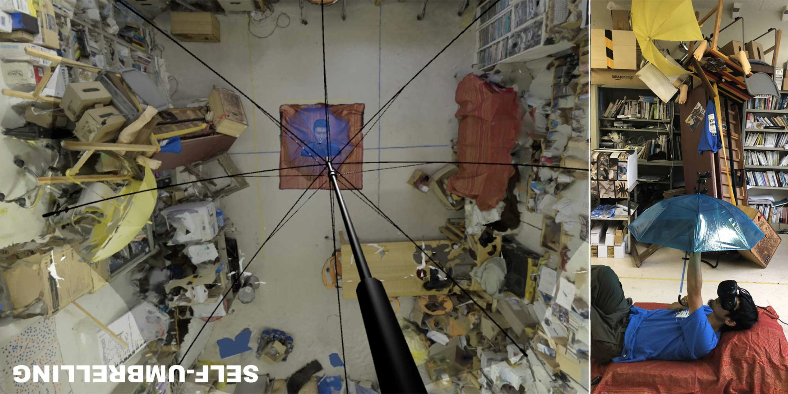 今日から、定期的に「からだは戦場だよ2018」(27・28)の出し物の予告をします。まずは「セルフ・アンブレリング(重力反転計画α)」というHMD装置について。映像の通り、寝ている自分(身体的自己)が傘を開くことで、それを上方から見下ろしている自分(視点的自己)が上に吹き上げられていきます。 pic.twitter.com/bQiP6wiidK