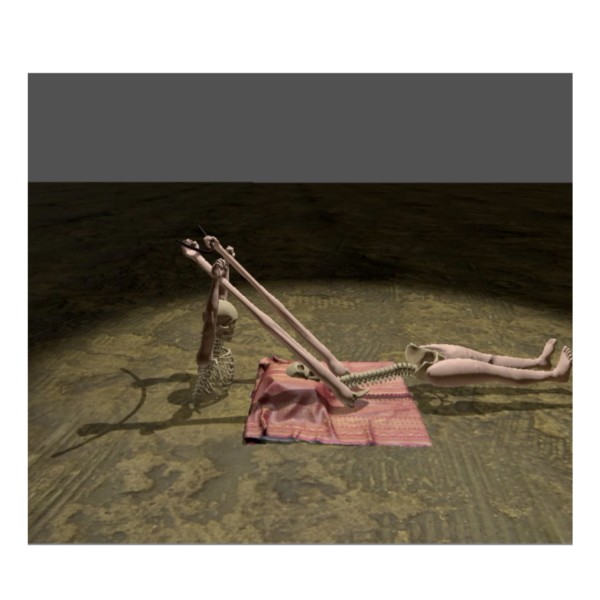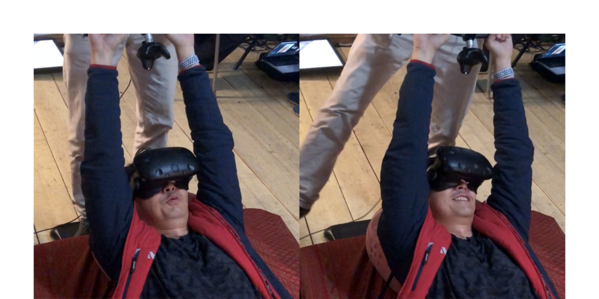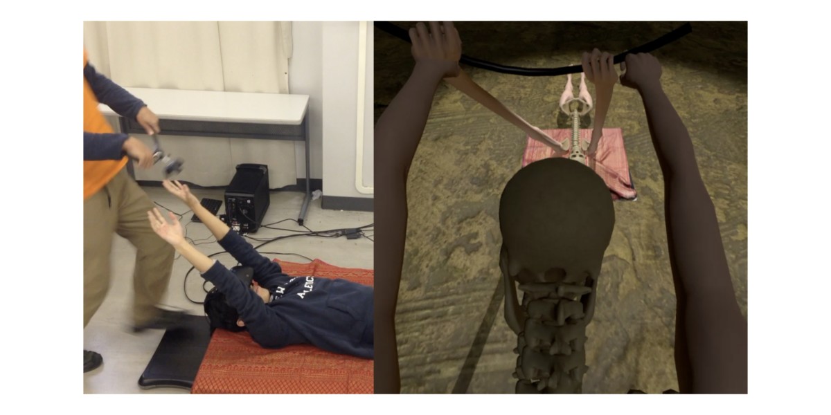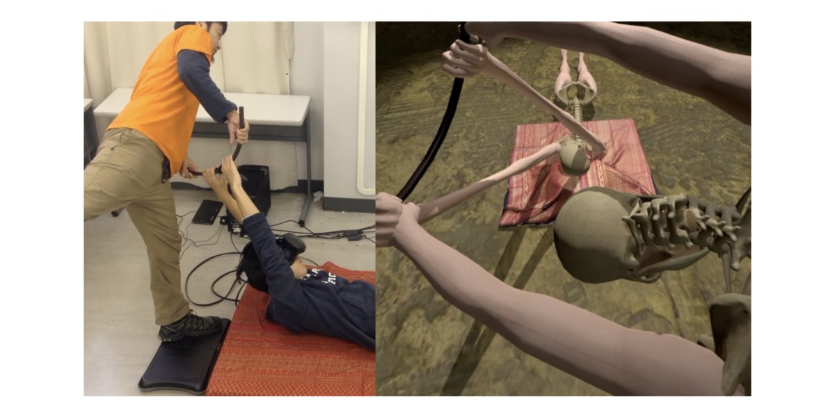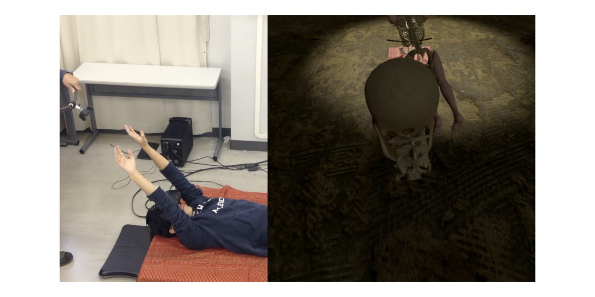 体験者は、仰向けに寝転がったまま両手でパイプを握ります。補助者の手によってパイプが引っ張り上げられるのと同時に、HMD上の視界はちょうど「大車輪」を行うようにぐるりと回転し、自身の寝転がった身体を見下ろす位置へと上がっていきます。この「大車輪」の角度は、Wii Boardによって計測された、補助者の体重増加量によって増減します。