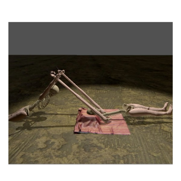 移動した視点において体験者は、自身が天井から床を見降ろしているかのような、重力方向の反転した錯覚を感じ、同時に、自分の腕を引っ張られながらにして自分が腕を引っ張る側に立っているような、受動と能動の反転する錯覚を誘発します。以上のような、「重力方向」および「受動と能動」、二つの反転した錯覚を内包するインタラクションを設計しました。