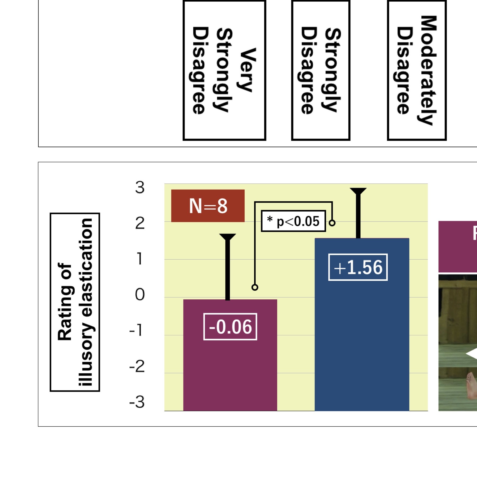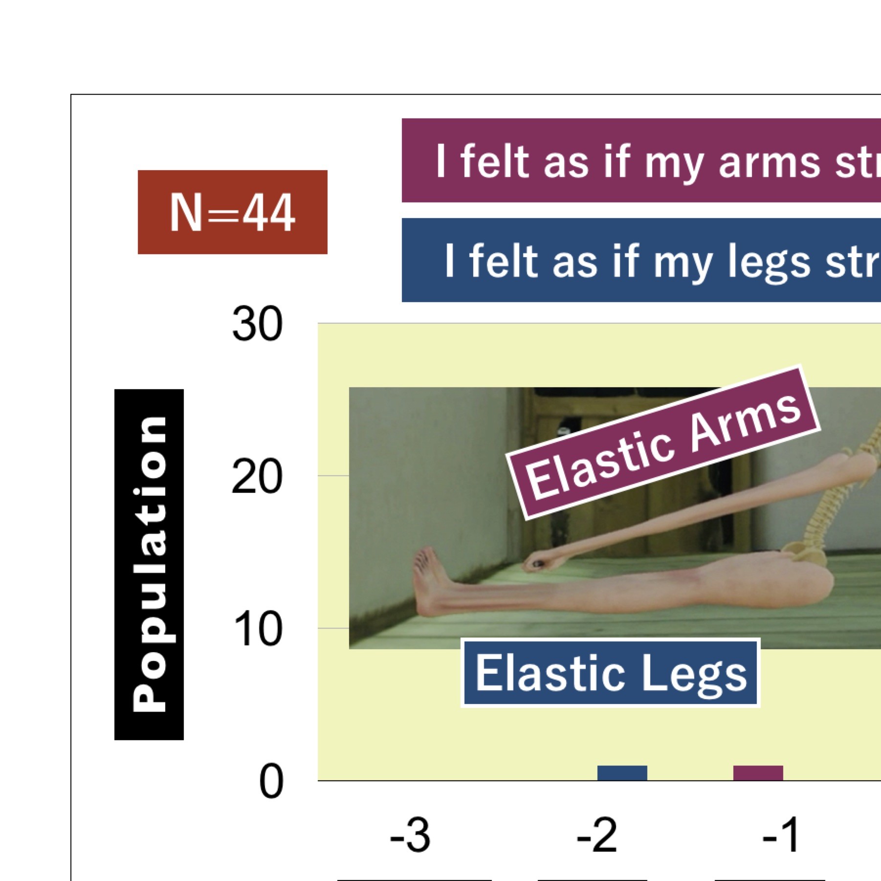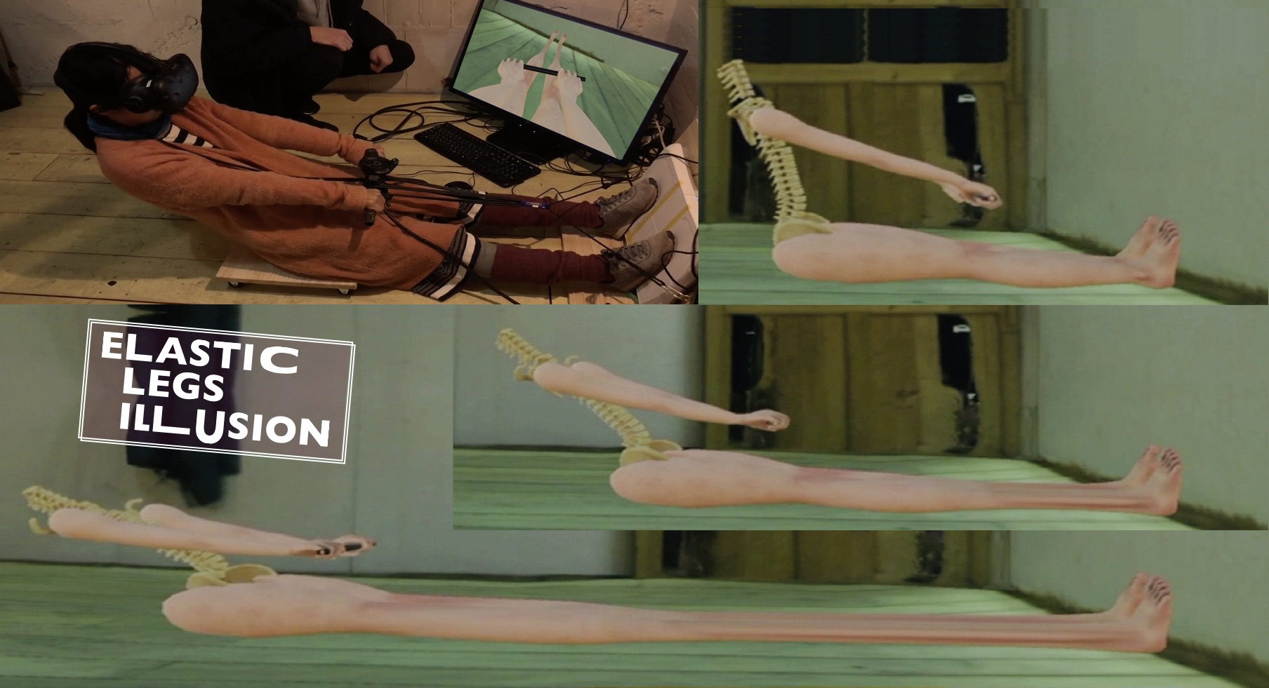 Elastic Legs Illusion (ELI) provides the striking illusory experience of having a longer legs where the virtual legs are visually stretched from the first-person perspective. This illusion works without any experimenter’s assist; a single subject wearing a HMD sits on a floor with both legs stretched straight out against a wooden-plate and pulls backward a handle connected with rubber-material tube, that is anchored at the plate. A weight scale (Wii Balance Board) is placed sandwiched between the both legs and the plate where the more strongly the subject pulls the handle the more load is transferred to both legs as well as to the weight scale. ELI correlates this increment of the weight scale with the stretch ratio of the legs in HMD space. Thus, the sense of legs being pushed back against the plate is transformed into a sense of having longer legs. The system was tested in our laboratory exhibition, showing 33 out of 44 participants agreed with having longer legs strongly.