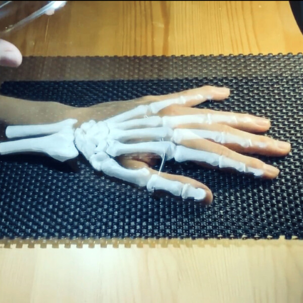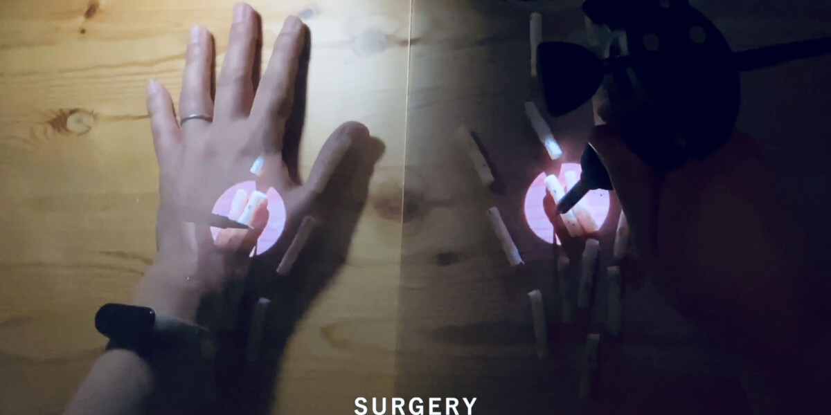 XRAYSCOPEは、まるで自分自身の手の表面を透視し、身体内部のオブジェクトに直接アクセスする感覚を誘発するインタラクション作品である。本作品は、心理学において幻肢痛を緩和させる装置として提案されたMirror Visual Feedbackの鏡を空間の明暗差によって透過と反射の二つの性質を有するハーフミラーに置き換え、三次元位置がトラッキングされた擬似照射スコープを用いて、骨に模したオブジェクトの各部に照射を行うものである。この手法により、手の内部にあるオブジェクトを、半透明化した皮膚の表面を通して覗きみているような感覚(透視感覚)を生み出すことに成功した。さらに、照射スコープの鋭い先端で、オブジェクトを直接に「つつく」ことによって, 自身の「骨」に対して触覚的な感覚を得ることも可能である。