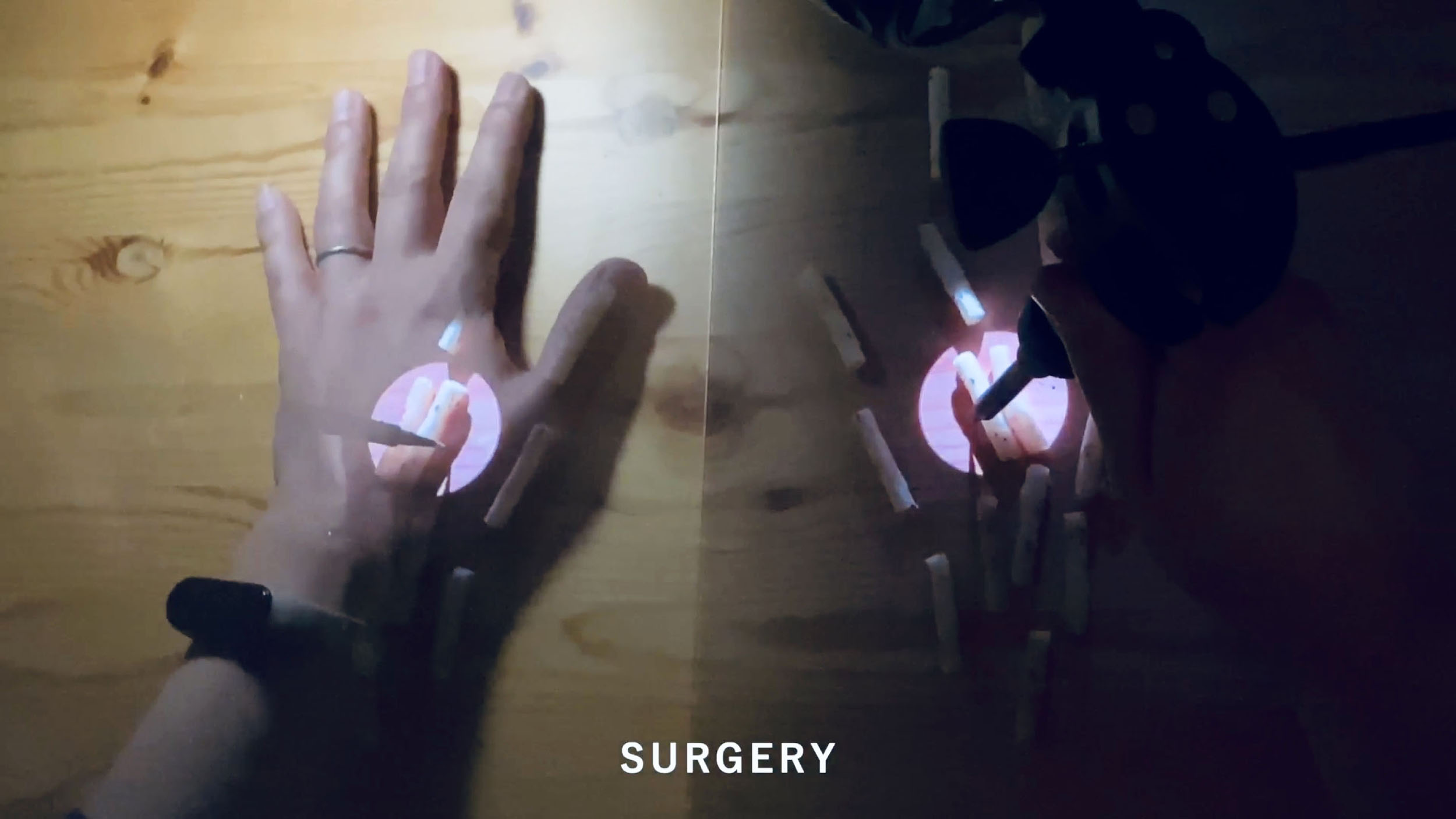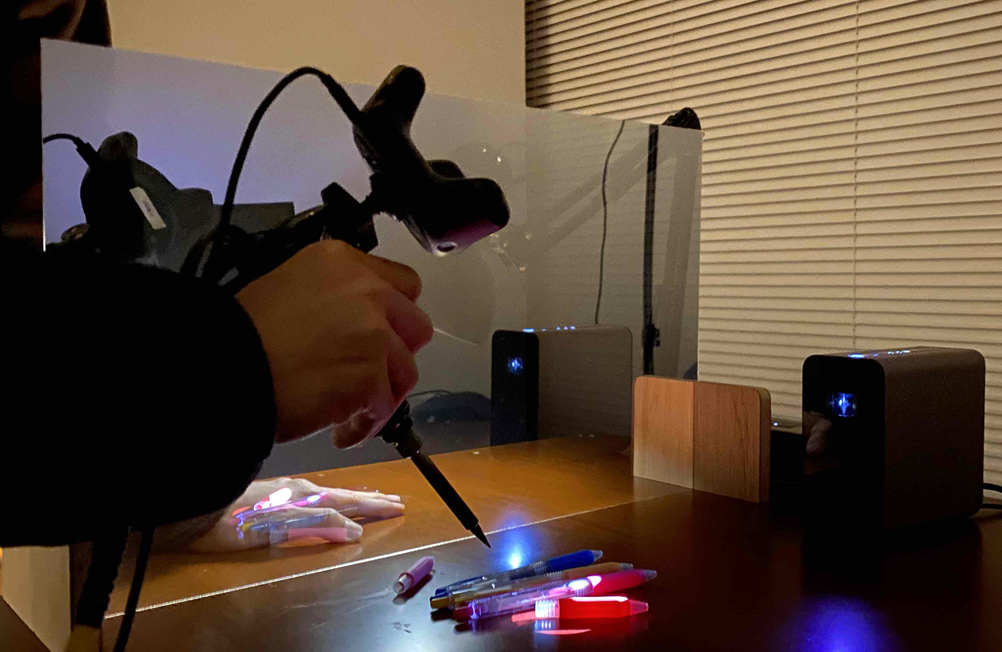 XRAYSCOPEは、まるで自分自身の手の表面を透視し、身体内部のオブジェクトに直接アクセスする感覚を誘発するインタラクション作品である。本作品は、心理学において幻肢痛を緩和させる装置として提案されたMirror Visual Feedbackの鏡を空間の明暗差によって透過と反射の二つの性質を有するハーフミラーに置き換え、三次元位置がトラッキングされた擬似照射スコープを用いて、骨に模したオブジェクトの各部に照射を行うものである。この手法により、手の内部にあるオブジェクトを、半透明化した皮膚の表面を通して覗きみているような感覚(透視感覚)を生み出すことに成功した。さらに、照射スコープの鋭い先端で、オブジェクトを直接に「つつく」ことによって, 自身の「骨」に対して触覚的な感覚を得ることも可能である。