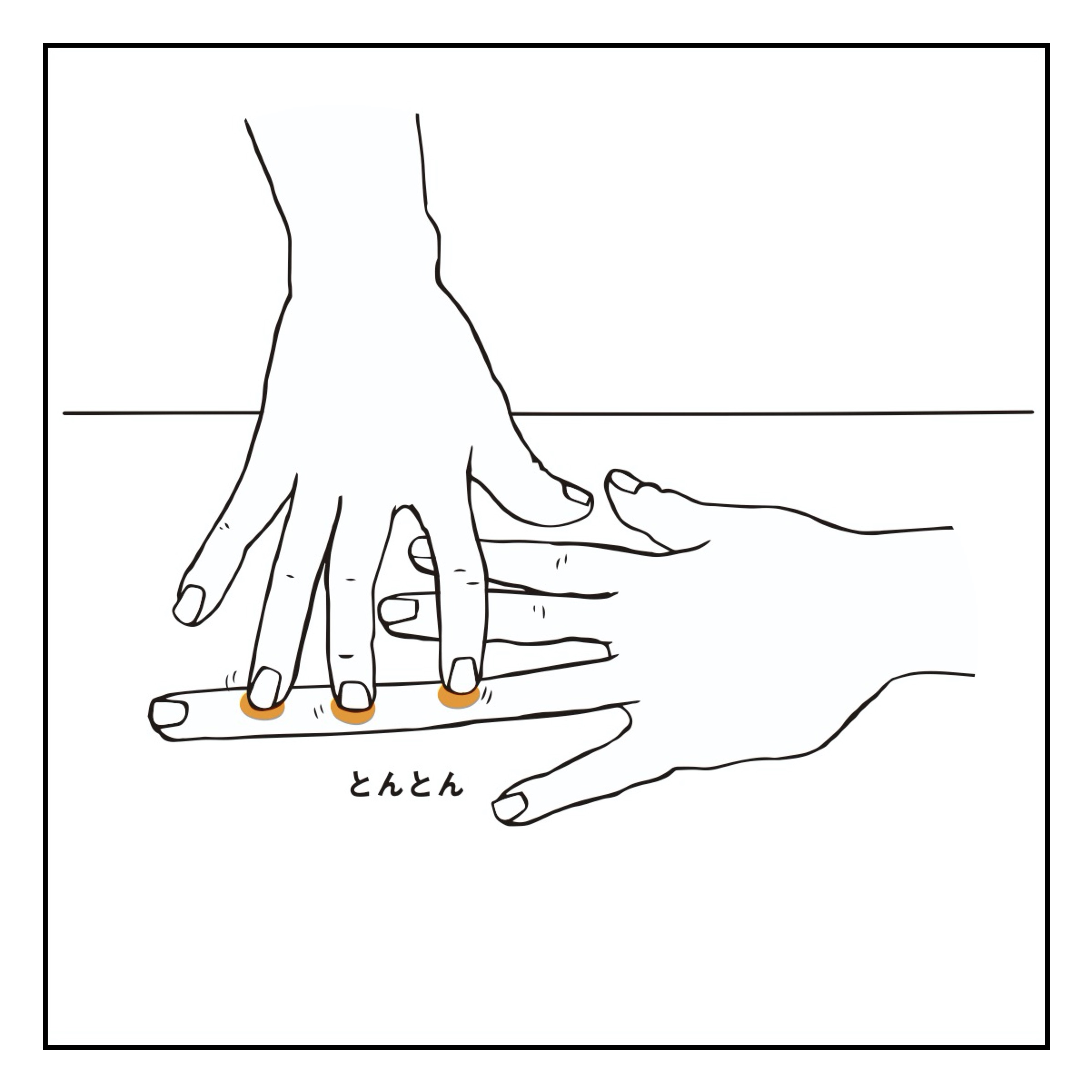 - 右手の人差し指を、左手の薬指の爪のすぐ内側に、右手の中指と薬指をペンの表面に添え、目を閉じた状態で、三点の同じ場所を同時にとんとんする。