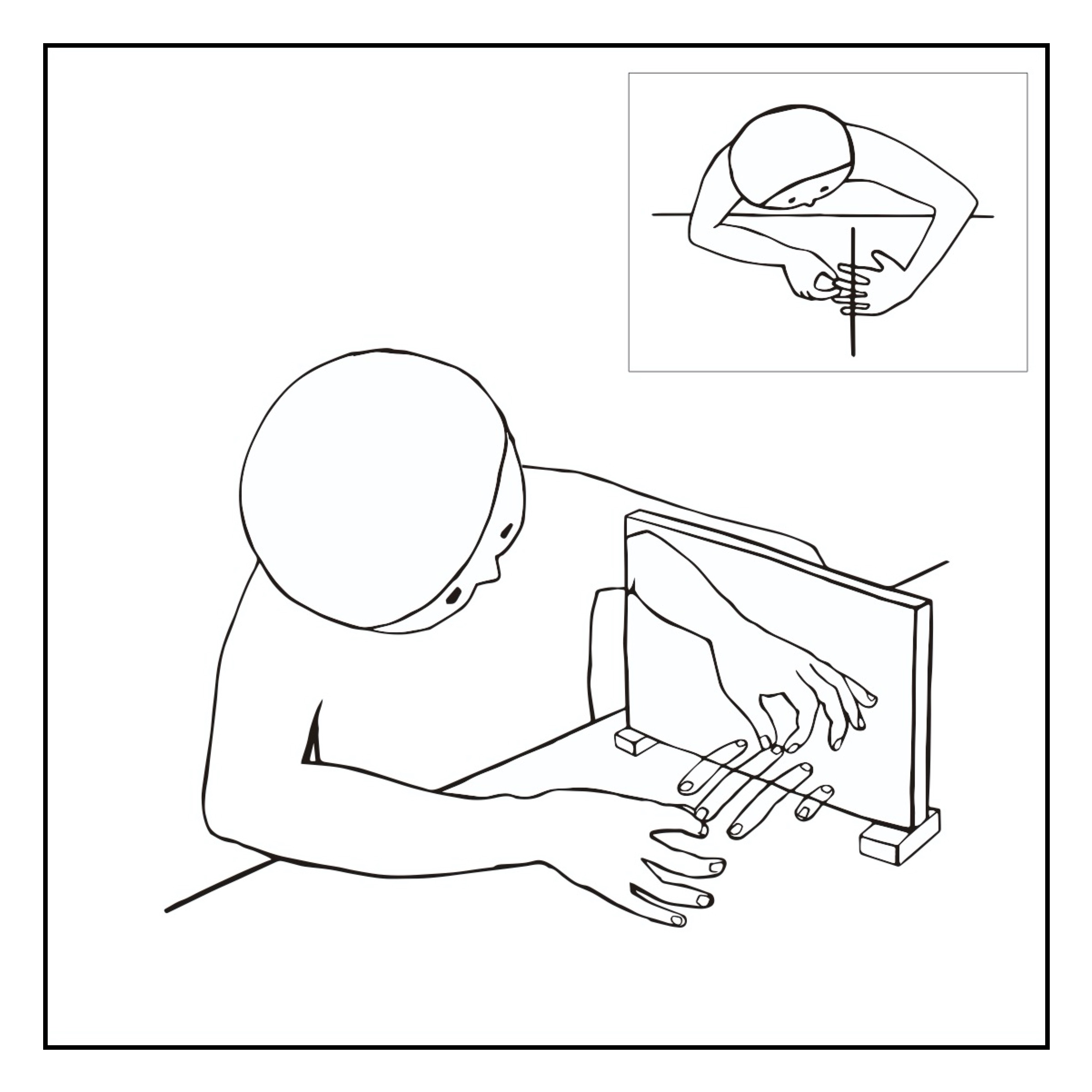 - 鏡の裏側から、鏡に隠れた左手の指を隙間を通して手前側にスライドさせ、鏡像を見ながら、露出した左手の指のそれぞれを右手で触る(逆も可)。